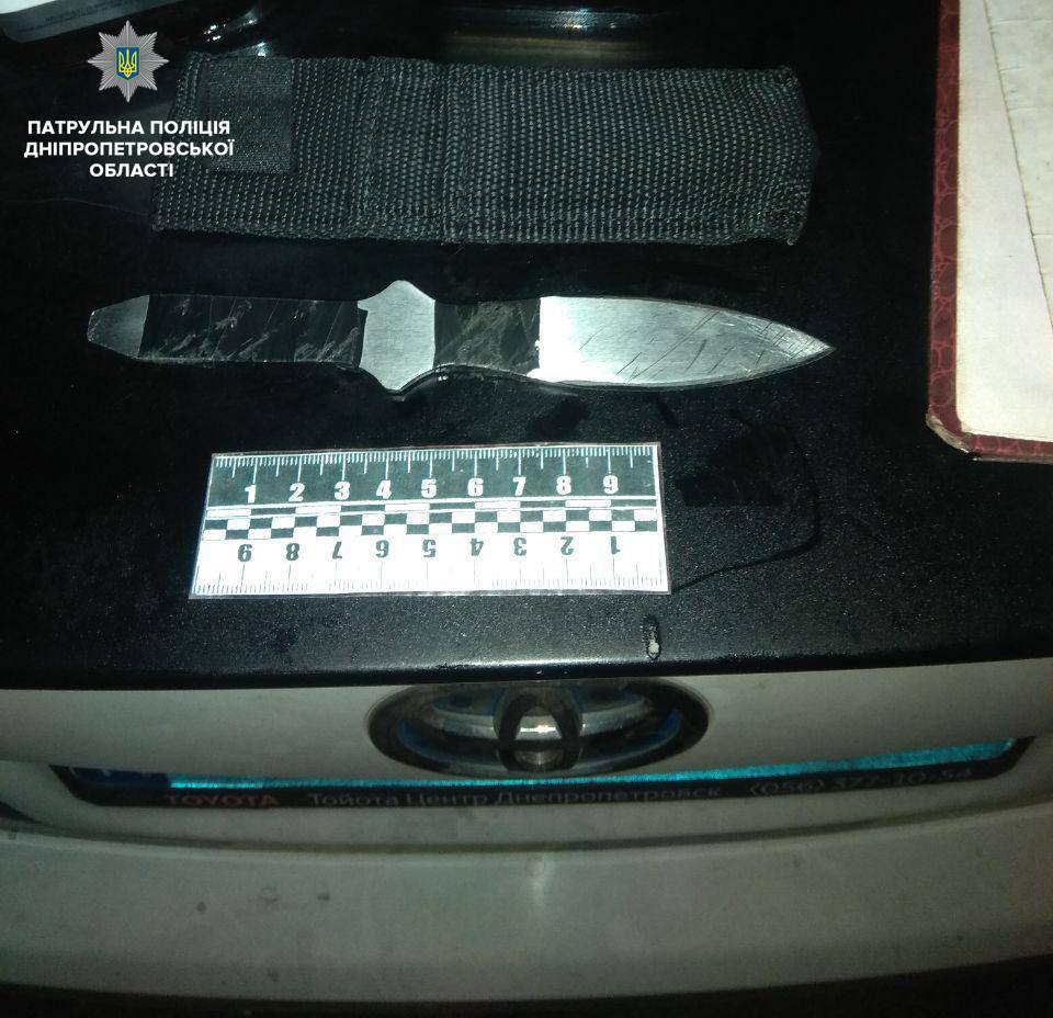 7 листопада, близько опівночі спецлінії 102 надійшло повідомлення від громадян про те, що на зупинці на проспекті Гагаріна невідомий кидається з ножем на перехожих та пошкодив скло в тролейбусі. Патрульні одразу прибули на виклик. На зупинці вони виявили і затримали чоловіка у стані алкогольного сп’яніння, який поводився неадекватно та плутався у відповідях. Повідомляють у прес-службі патрульної поліції Дніпра.