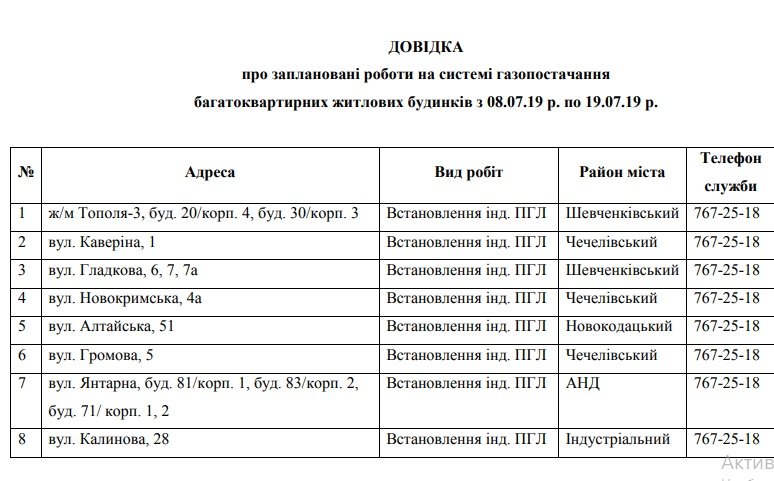 У “Дніпрогазі” повідомили про графіки виконання робіт на внутрішньобудинкових системах газопостачання та встановлення лічильників газу. У зв’язку з цим з 8 з по 19 липня газопостачання у домоволодіннях дніпрян може бути тимчасово призупинено . Йдеться на сайті компанії.