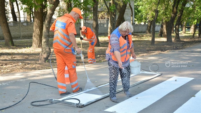 «У цілому у Дніпрі 469 пішохідних переходів розташовано біля закладів освіти. З них 311 нанесені пластиком, який має гарантію 3 роки і не потребує щорічного оновлення. Інші 158 – нанесені фарбою. Тож їх необхідно регулярно оновлювати. З початку 2023 року ми оновили близько 120 пішохідних переходів біля навчальних закладів. А це – 75 %. Роботи в цьому напрямі ще тривають. Ми плануємо до середини осені їх завершити», – прокоментував начальник виробничого відділу КП «Транспортна інфраструктура міста» ДМР Михайло Солярчин.