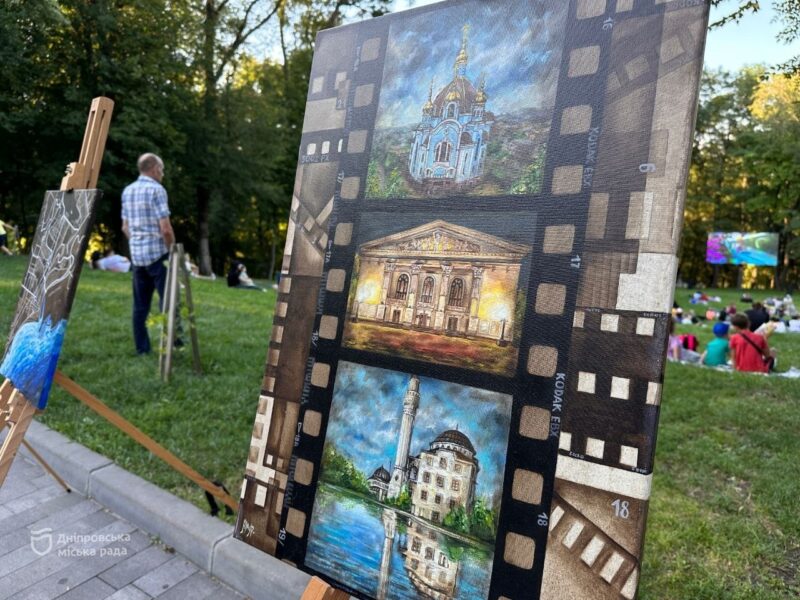 У парку Зелений Гай провели мистецький захід «Війна на Пензлі «АRТ DAY». У програмі: виставка творчих робіт художниці з Маріуполя Олени Мурашкіної, майстер-класи, концертна програма. Організатор заходу — комунальний заклад культури «АРТТЕРИТОРІЯ». Повідомляють у Дніпровській міській раді. «Це серія робіт «Життя крізь війну» про моє рідне місто. Для мене надзвичайно важливо нагадувати людям про Маріуполь, що місто існує, про те, що воно пережило. Частина картин про власні почуття до міста. Усі ці роботи написані вже після повномасштабного вторгнення. Багато зображено архітектури. На жаль, багатьох будівель уже нема. Серед важливих для мене картин – це драматичний театр, картина з трьома янголами, присвячена моїй бабусі, яка загинула у Маріуполі під обстрілами, про «Азовсталь»», — розповідає художниця Олена Мурашкіна.