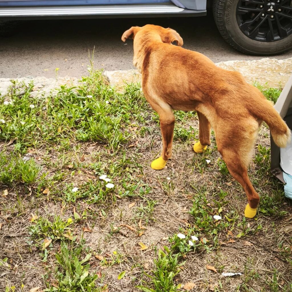 На передніх лапах збережені подушечки. Ймовірно на них Мрійка зможе ходити (що вона і показала волонтерам після лікарні, на фото – сама стояла).