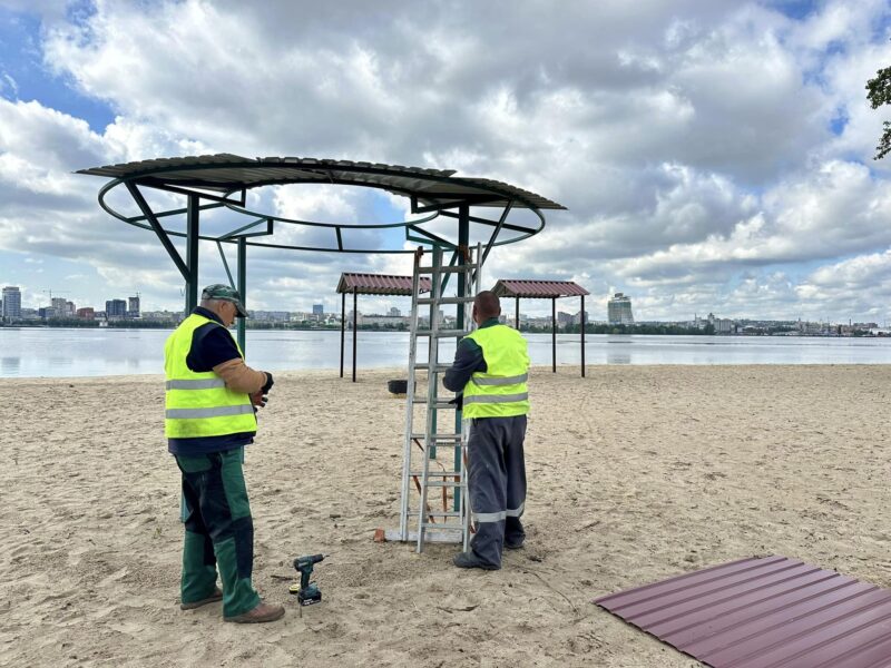 Нині такі роботи тривають на Мануйлівському пляжі. Тут комунальники вже прибрали гілки, водорості та очерет. Розвісили таблички «Купатись заборонено». Також завдяки спеціальній машині вони просіяли пісок від різного дрібного сміття.