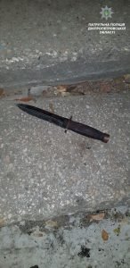 Під час затримання надійшов виклик, що годину тому невідомі розбили вітрину магазину на проспекті Поля, погрожували продавцю ножем, та відібрали гроші – приблизно 1,5 тисячі гривень. Як виявилося, до цього могли бутипричетні громадяни, які погрожували охоронцям порядку. На місце події поліцейські викликали слідчо-оперативну групу, яка вилучила ніж. Громадян доставили до Дніпровського відділку поліції.