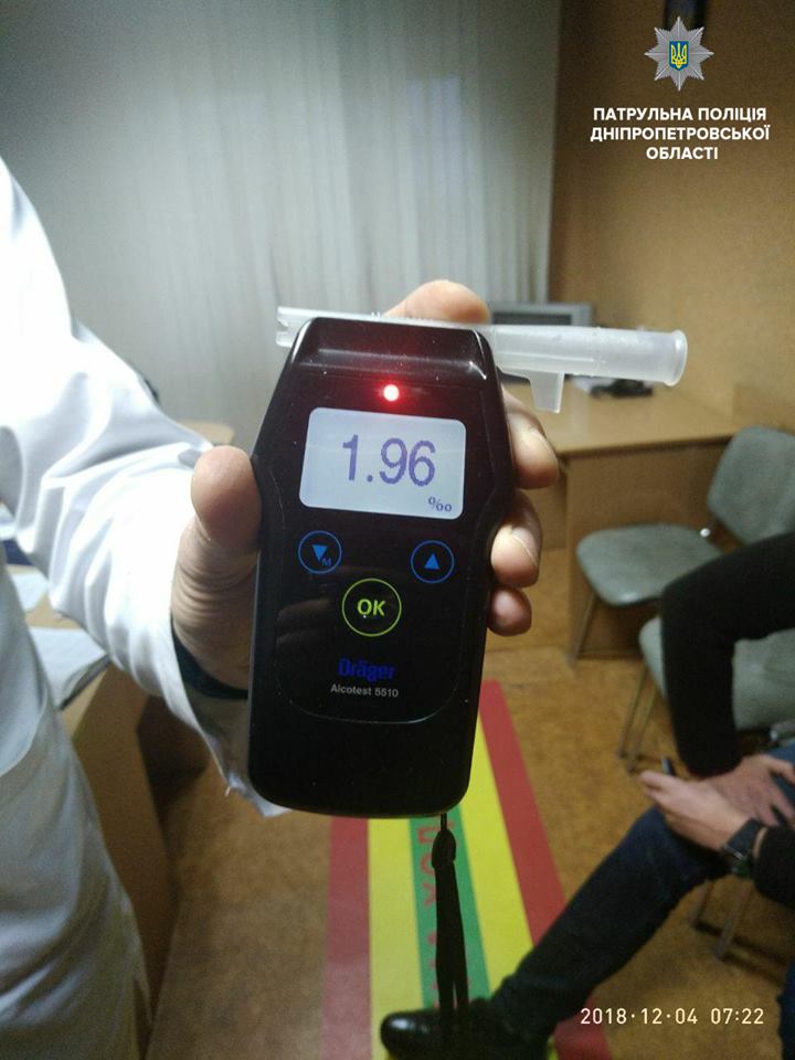 На чоловіка там склали адмінматеріали за ст. 173 КУпАП (Дрібне хуліганство) та ст.185 КУпАП (Злісна непокора законному розпорядженню поліцейського). Водій же пройшов освідування. Результат на наявність алкоголю в крові чоловіка підтвердився – 1,96 проміле. Він отримав протокол за ст. 130 КУпАП (Керування у стані сп’яніння)