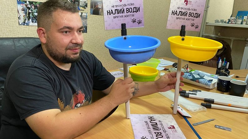 “Зараз на дворі спека, тварини від неї потерпають і гинуть. Два-три дні і тварина гине без води”, — говорить Сергій. Першу поїлку волонтери встановили біля свого штабу. Чоловік каже: з неї п’ють багато тварин. Наступну поїлку він встановив на Січеславській Набережній. Локацію обрав через велику кількість собак та котів.