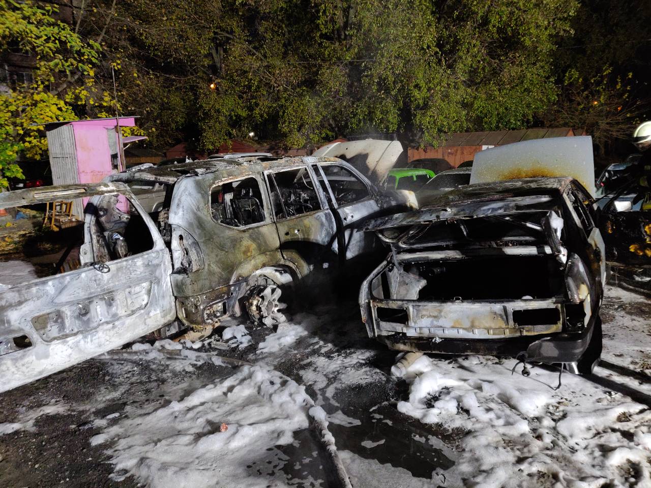 Вогнеборці встановили, що пожежа виникла на тимчасовій зупинці. Вогнем знищено два легкових автомобіля – Toyota Prado та ВАЗ-21099. Також пошкоджено два близько розташовані легкові автомобілі Hyundai Accent та Volkswagen Polo на загальній площі 22 м.кв.