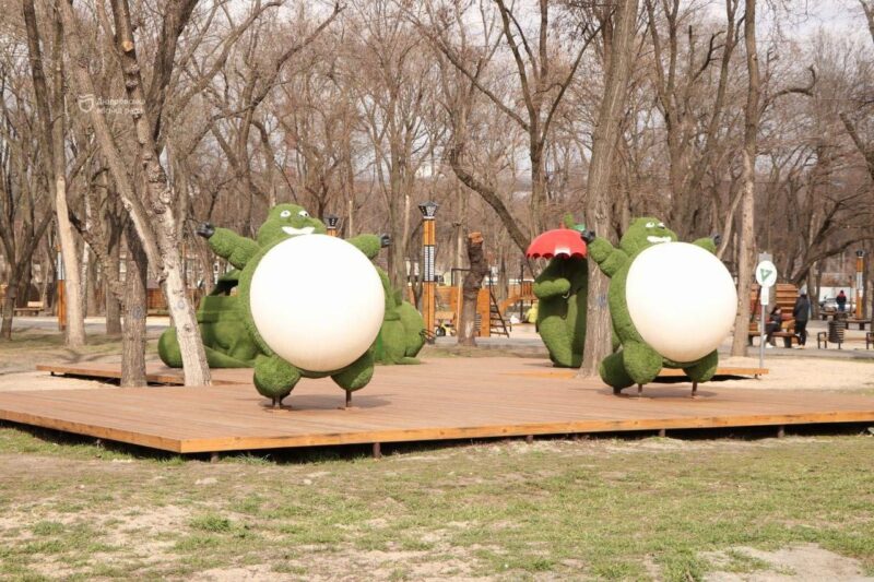 «Цей сквер за останні три роки привели до ладу. До цього тут була цілком захаращена територія з купою сміття. Зараз він має цілком інший вигляд. Серед іншого зробили алеї, встановили лави, урни для сміття, освітлення. Прибрали сухостій, підсадили нові хвойні дерева. А нині за проєктом тут з’явився дитячий майданчик. Без перебільшення, – один із найкращих у цьому районі. Він багатофункціональний. Усі елементи зроблені з дерева, що цілком безпечно для дітей. Деталі можна буде легко замінити, якщо вийдуть з ладу. Зараз тут пісок, але у подальшому плануємо зробити тут гумове покриття. Родзинка цього дитячого майданчику – зона із великими мультяшними героями – котобусами. Ввечері вони гарно світяться. Це ще й гарна фотозона. Дорослі з дітками полюбляють тут фотографуватися», – розповів директор комунального підприємства «Міська інфраструктура» Дніпровської міської ради Олексій Тесля.