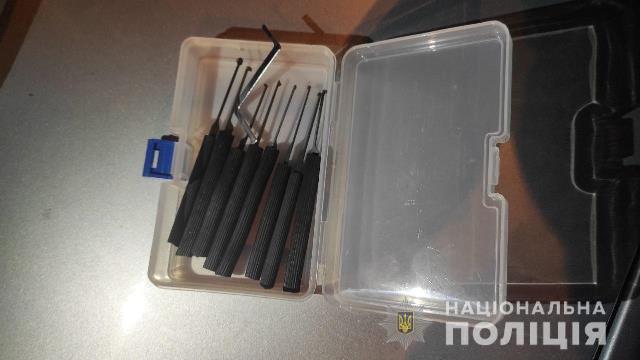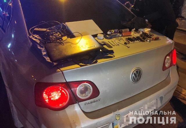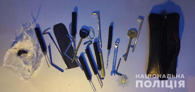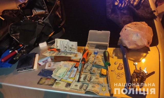 Під час затримання поліцейськими було проведено обшук у автівці зловмисників та вилучено: набір відмичок, мобільні телефони, банківські картки, ноутбук, 1 800 доларів США, вироби із золота, документи та інші речові докази, що підтверджують злочинну діяльність фігурантів.