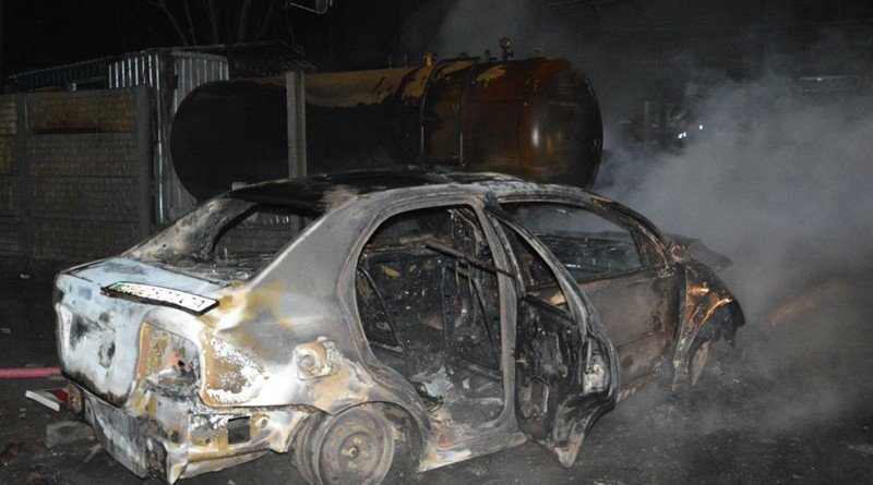На місці події з’ясовано, що автомобіль марки «Шевроле» здійснив наїзд на ємність з газом на території автогазозаправної станції (АГЗС). Внаслідок зіткнення було пошкоджено герметичність ємності та виникла пожежа, площею 50 квадратних метрів.