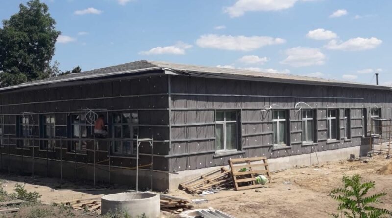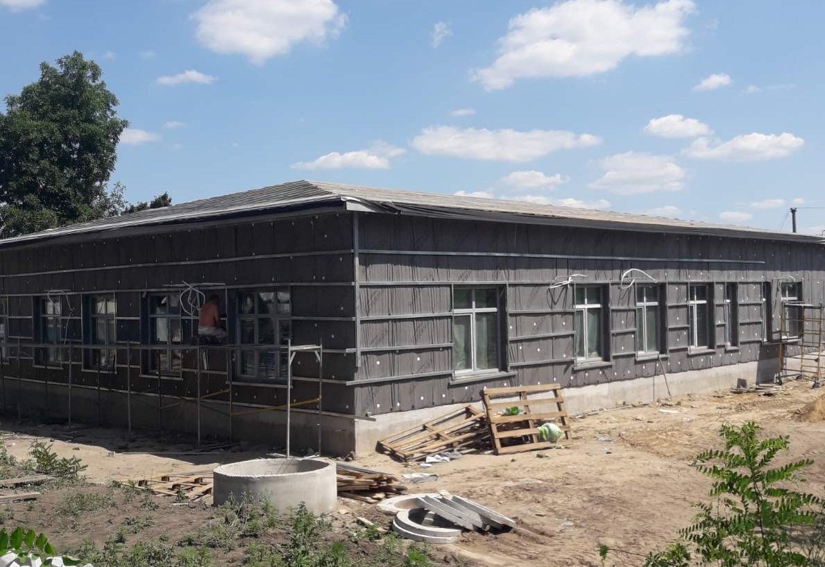 Будівельники звели стіни, улаштували плити перекриття будівлі, змонтували металоконструкції та обрешітки під покрівлю з металочерепиці. Тепер утеплюють фасад, роблять цементну стяжку підлоги, виконують електромонтажні роботи.