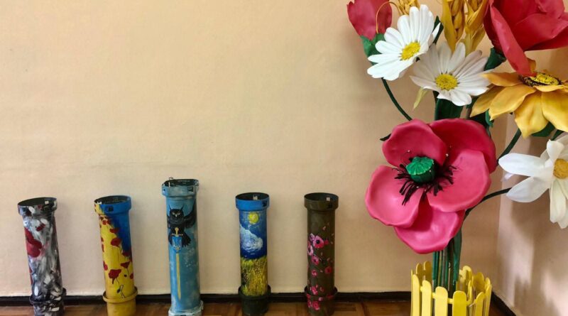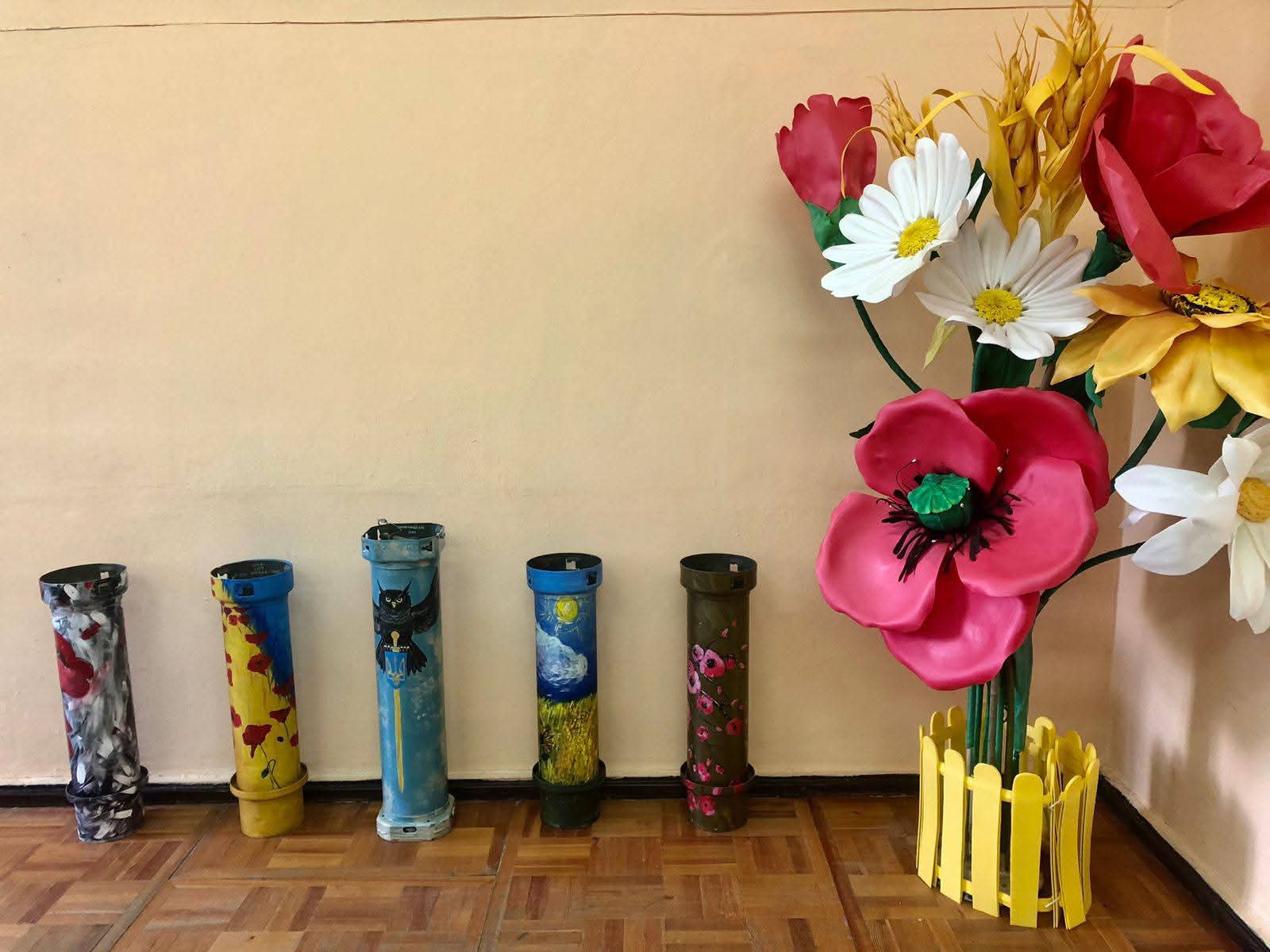 Окрім картин, у виставці представлені також особисті речі захисників із Жовтих Вод і військові артефакти з фондів місцевого музею. А розписані тубуси для оформлення експозиції надала художня студія Люсі Новошевської.