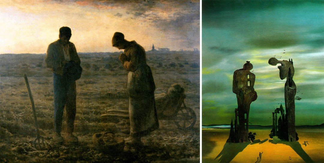 Упомянутая картина была написана Дали в 1935 году. Оригинальный «Анжелюс» был выполнен по заказу американского художника Томаса Эпплтона, который был очарован картиной Джона Милле – «Сборщицы колосьев». Свое название полотно получило в честь первых слов молитвы Angelus Domini, которая читается католиками три раза в день. Картина изображает крестьянина с женой на закате, которые стоят, склонив головы, и слушают церковный колокол, призывающий к молитве.