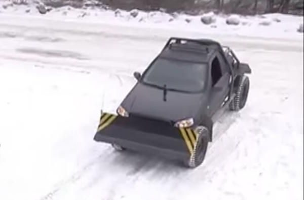 Также машина оснащена каркасом безопасности и дополнительными освещением. Подушки, безопасности, обогреватель, небольшой багажник – в наличии. Еще одна особенность внедорожника — двигатель расположен сзади.