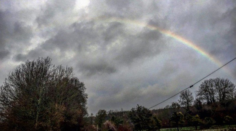 “Раптом з-під чорнючих хмар виглянуло сонце, буквально на одну хвилину. І через мою дорогу виросла веселка. Така стрімка, що поки намалювалася друга нога, перша нога вже зникла. Я ледве встигла сфотографувати. Ну от треба ж було пройти через цю зливу, щоб побачити таку магічну красу, та ще й 1 січня…”, – написала вона, додавши фото.