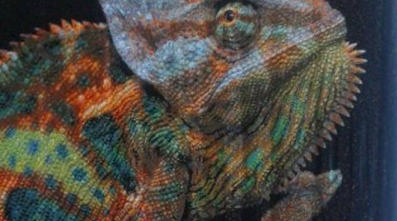 Київська майстриня Тетяна Романенко створила неймовірну картину – вона вишила бісером гігантського хамелеона! Майстриня для цього використала 748 відтінків кольорів бісеру!