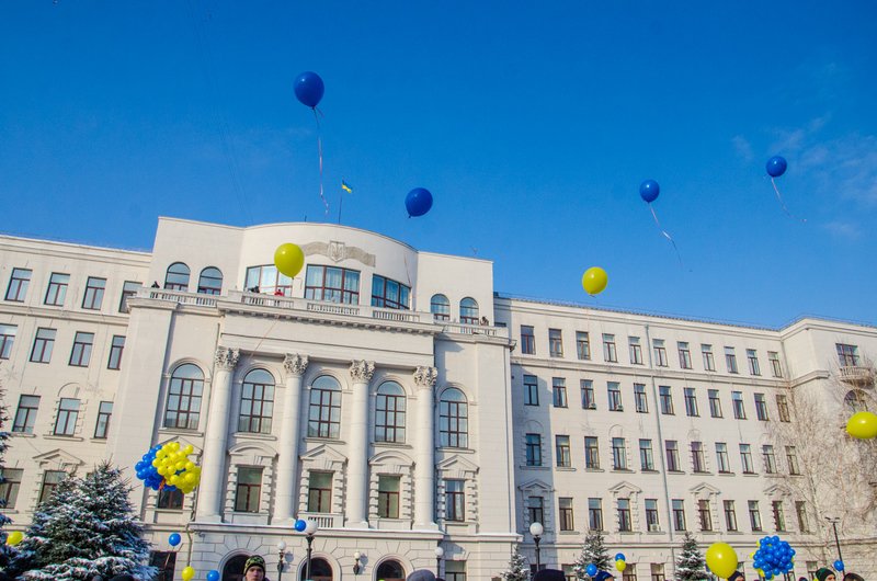 Незважаючи на мороз до Дніпропетровської облдержадміністрації прийшло декілька сотень людей: всі з квітами, прапорами, синіми та жовтими кульками. Разом зібралися, щоб відзначити День Соборності України. Спочатку вшанували загиблих героїв Революції гідності й воїнів АТО. Потім – співали українські пісні та влаштували флешмоб – розгорнули величезний Прапор України. Масштабні урочисті заходи сьогодні проходитимуть по всій Дніпропетровщині.