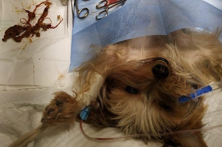 На фото комок ниток, извлечённых из йоркширского терьера.