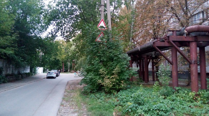 На жилмассиве Победа -1 расположена школа №76. Стоят соответствующие знаки, есть лежачие полицейские. Только проблема: знаки заросли, и их не видно, стёрлась зебра и двух лежачих полицейских явно мало, чтобы обеспечить безопасность.