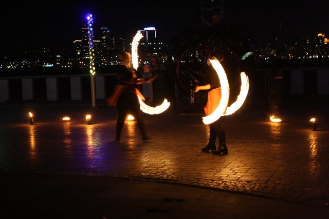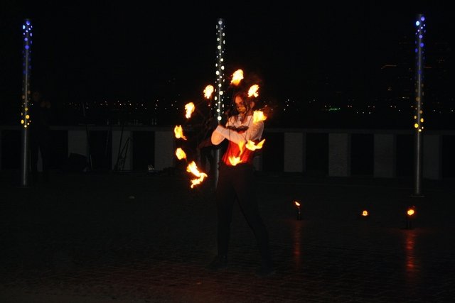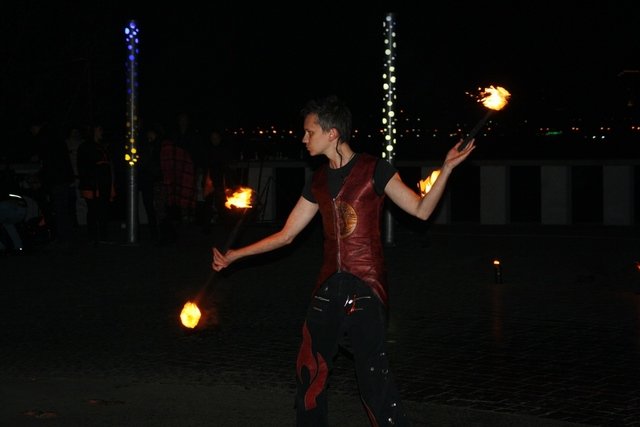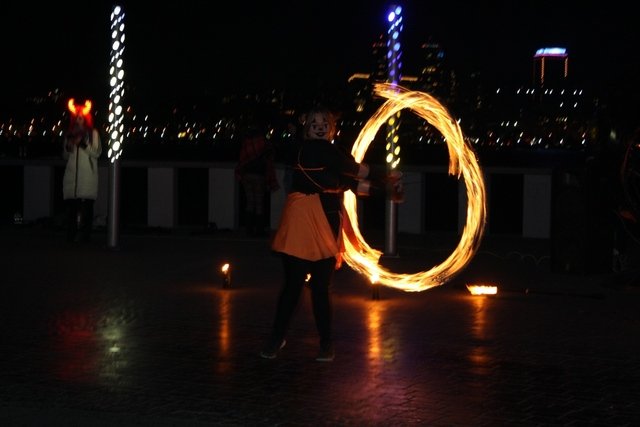 Холодная осенняя погода – время, когда танцоры с огнем уже начинают переходить с «горящего» на «световой» реквизит и используют устройства со светодиодами. Причина – в температуре на улице – она не дает огню разгореться и поэтому артисты не могут продемонстрировать всю красоту танца с пламенем.