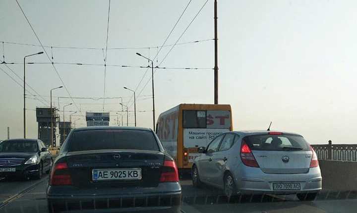 Старый мост Днепра стоит в пробках. Из-за этого городские маршрутки курсируют не по графику – задержка составляет 25-30 минут.