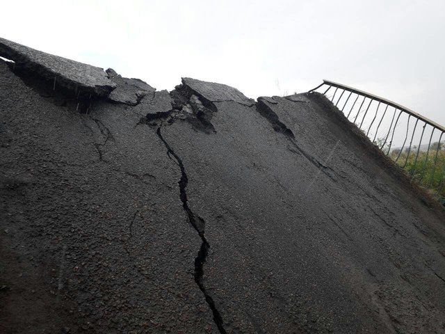 На фото, сделанные сотрудниками ГСЧС, видно, что бетонные блоки, которые удерживали конструкцию, надломились и под тяжестью средней части путепровода опустились вниз, причем с одной стороны – практически перпендикулярно земле.