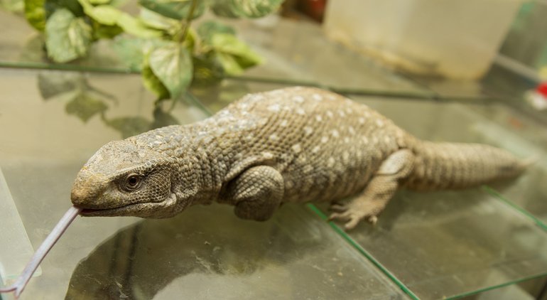 Справка. Капский варан, которого также называют варан Боска или степной варан – вид пресмыкающихся из семейства варанов. В Капских горах этот варан не живет, однако получил такое название из-за того, что в Европу его впервые привезли из Южной Африки. Ареал распространения капского варана – полевые зоны с запада на восток Центральной Африки. Взрослые животные имеют длину от 80 см до 2 м. У капских варанов короткое туловище и морда с косо поставленными ноздрями, по форме напоминающими щели, которые расположенные очень близко от глаз, короткие пальцы с очень большими когтями. Тело покрыто мелкими чешуйками, хвост сжат с боков и имеет двойной гребень. Окрас серо-бурый с желтыми полосками и пятнами. Ведет наземный образ жизни, с наступлением жары прячется в укрытия. Питается мелкими млекопитающими, насекомыми, лягушками, раками.