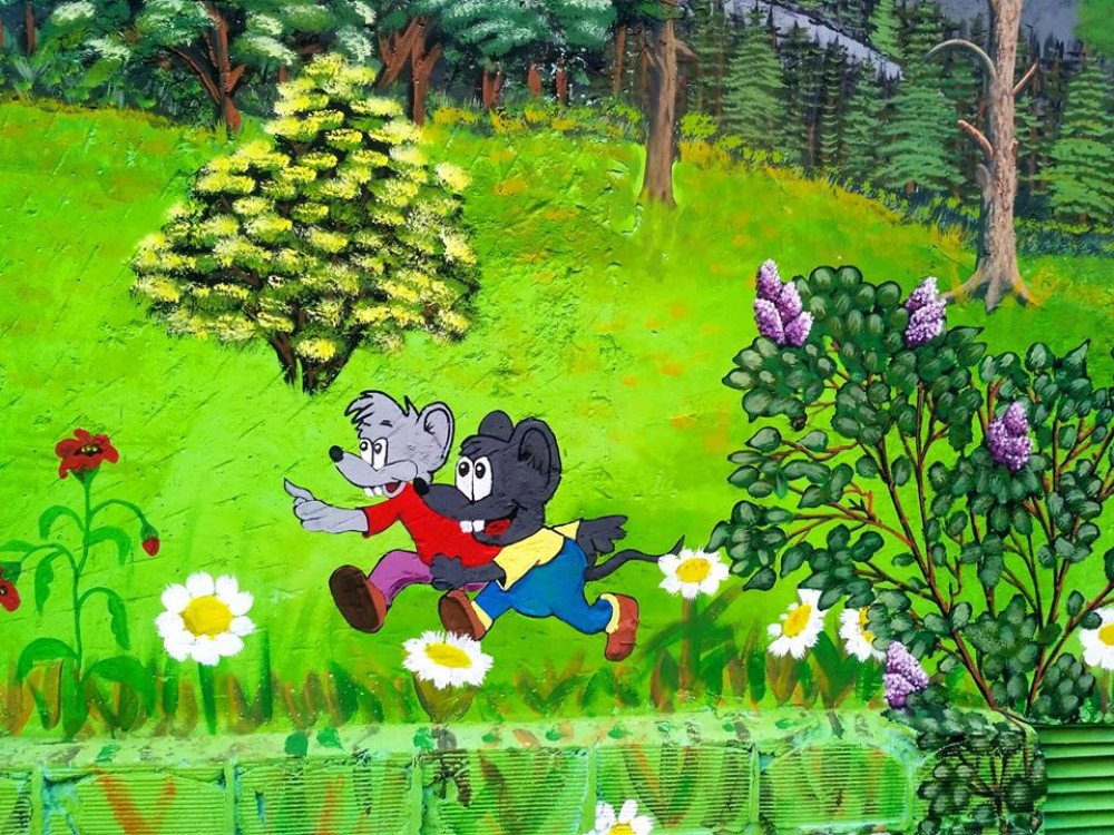 На стене трансформаторной будки во дворе дома по улице Бреуса в Одессе появился мурал со сказочными персонажами Эдуарда Успенского, Александра Милна, Астрид Линдгрен, а также советских мультфильмов.