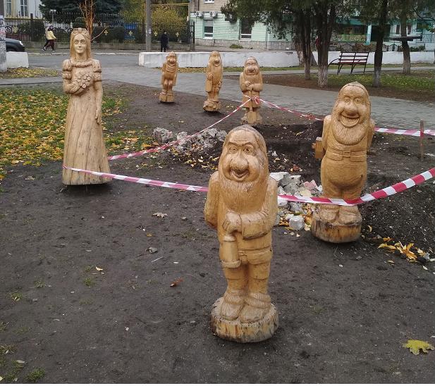 В Павлограде на детской площадке сказочные гномы простояли всего полтора месяца и их демонтировали в связи с тем, что фигурки периодически подвергались вандализму. Две фигурки даже отправляли на реставрацию.