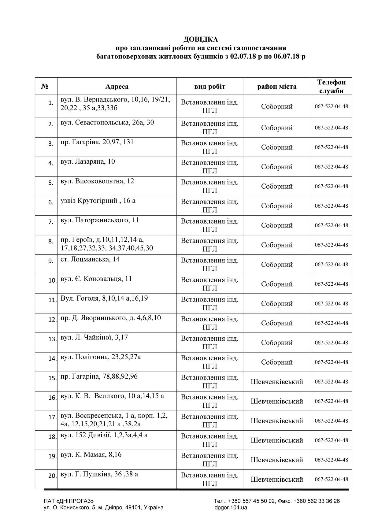 Во время выполнения работ газоснабжение в домовладениях может быть временно приостановлено. Возобновление газоснабжения ПАО “Днепрогаз” выполнит при отсутствии технических нарушений в работе газового оборудования, дымовых и вентиляционных каналов.