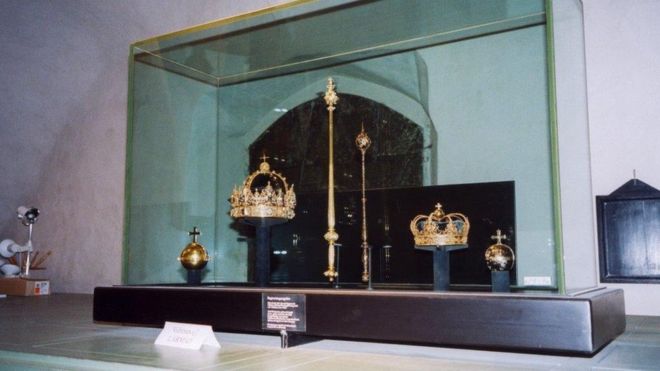 Две короны XVII века, изначально принадлежавшие королю Карлу IX и королеве Кристине, а также королевскую державу грабители вынесли из собора днем на глазах у посетителей. Считается, что преступники сбежали, используя обширную сеть близлежащих озер.