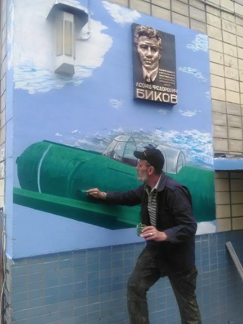 “Когда я впервые увидел мемориальную табличку на доме по улице Туманяна, 8, мне стало стыдно, и захотелось как-то ее оживить, что ли”, – признался журналистам “Сегодня” автор нового поэтического мурала. – Это кадр из знаменитого фильма “В бой идут одни старики”, где он в образе комполка Титаренко. Здесь еще будет нотный ряд и 15 звездочек. Думаю, до завтра закончу”.