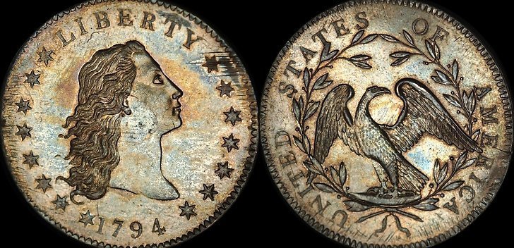 Серебряный доллар 1794 года выпуска, названный Flowing Hair (на нем изображена богиня Свободы с распущенными волосами) был первой монетой, отчеканенной в тогдашней столице США Филадельфии. Эту монету держал в руках и первый президент США Джордж Вашингтон. Как известно, на сегодня это сохранившийся лучше всего экземпляр доллара 1794 года.