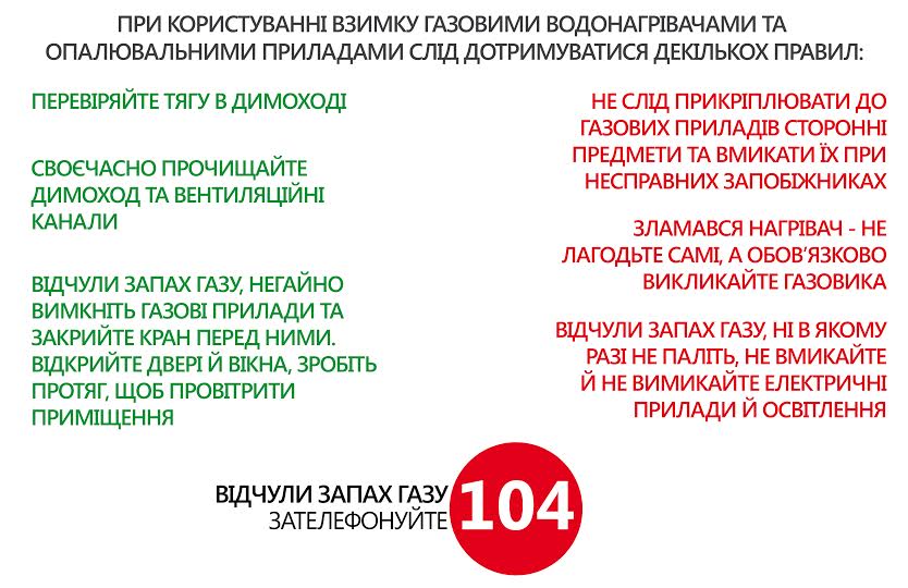 При користуванні взимку газовими водонагрівачами та опалювальними приладами слід дотримуватися декількох правил. Перед ввімкненням обладнання та під час його роботи перевіряйте тягу в димоході. Своєчасно  прочищайте його та вентиляційні канали. Коли в приміщенні немає тяги або вона зворотна, можна отруїтися чадним газом, говорять рятувальники.
