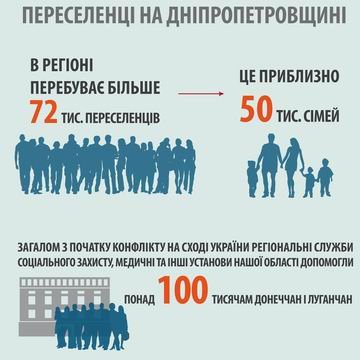 За останніми даними на Дніпропетровщині перебуває більше 72 тисяч переселенців, а це приблизно 50 тисяч сімей. Загалом з початку конфлікту на Сході України регіональні служби соціального захисту, медичні та інші установи нашої області допомогли понад 100 тисячам донеччан і луганчан.