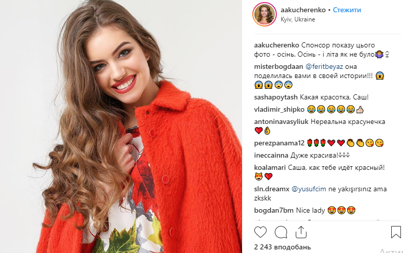 Відома красуня з Дніпра, володарка титулу «Міс Україна-2016» Олександра Кучеренко поділилася в Instagram-акаунті зі своїми шанувальниками осіннім настроєм і опублікувала в нове фото. На ньому відома дніпрянка одягнена в «кольори осені».