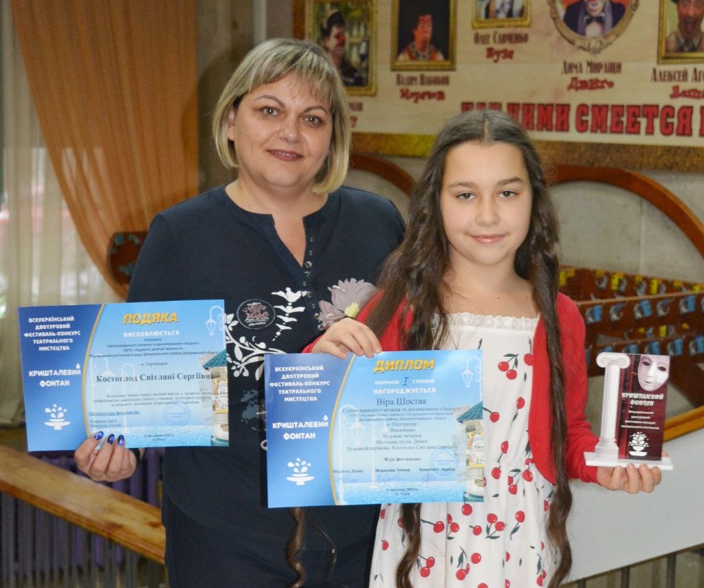 Юна підгороднянка Віра Шостак, вихованка гуртка виразного читання та декламування «Акцент» Будинку дитячої творчості м. Підгородне, взяла участь у Всеукраїнському фестивалі театрального мистецтва «Кришталевий фонтан», який відбувся 8 листопада на сцені Театру «Маски» Дім Клоунів у місті Одеса.