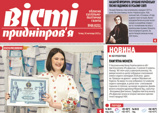 30 листопада вийшов черговий номер обласної газети “Вісті Придніпров’я”, в якому можна прочитати ексклюзивне інтерв’ю, цікаві та актуальні новини, а також корисну інформацію.