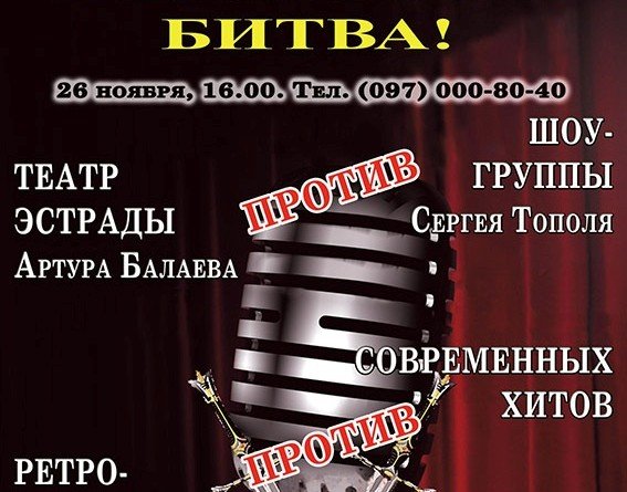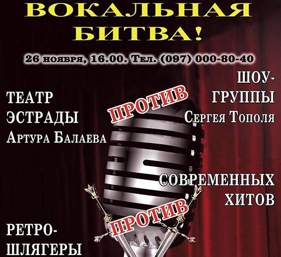 26 ноября в 16:00 в Театре эстрады состоится вокальная битва Артура Балаева против шоу-группы Сергея Тополя. В музыкальном поединке сойдутся ретро-шлягеры и современные хиты!