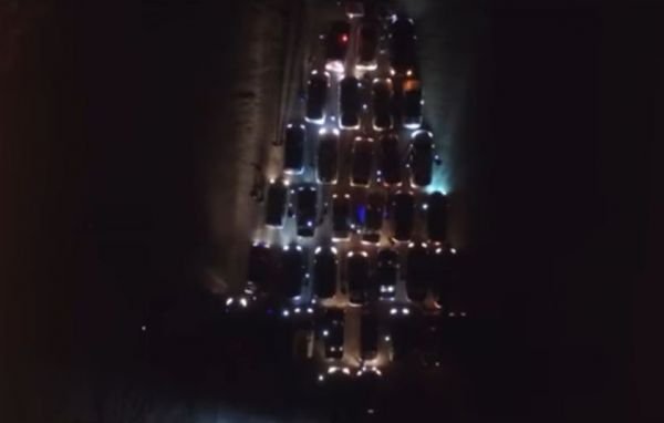 Запорожские водители умудрились построить елку из автомобилей. В качестве гирлянды выступили фары и сигнализация.