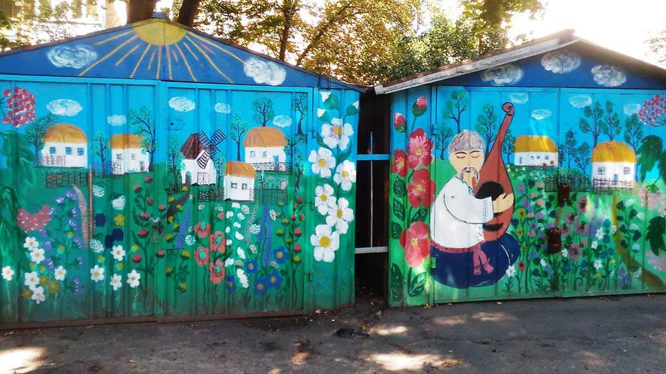 Жінка на ім’я Тетяна прикрасила власне та сусіднє подвір’я, а також гаражі у мікрорайоні Куренівка, що у Києві, чудовими малюнками на українську тематику. Така краса дуже сподобалась сусідами і вони поширюють фотографії у соцмережах.