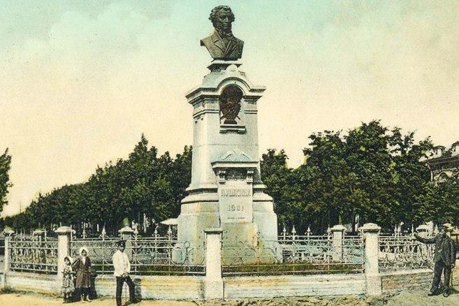 В Екатеринославе архитектор дебютировал несколько необычно. Первое его сооружение в городе – это постамент к памятнику А.С. Пушкину, открытому в 1901 году на Пушкинском проспекте. Панафутин справился с задачей так удачно, что постамент стал не просто подножием бронзового бюста скульптора И. Гинцбурга, а скорее наоборот – бюст стал завершением сложной архитектурной композиции. На постаменте – посвящение и дата установки памятника «Пушкину. 1901». Постамент украшают два сложных фронтона в неогреческом стиле – излюбленный мотив творчества Панафутина.
