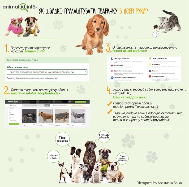 Міжнародна некомерційна онлайн база даних ідентифікованих тварин Animal-id.info запустила новий сервіс, що дозволяє прискорити процес влаштування тварин в нові оселі. Підключитися до нього можуть як зареєстровані організації з порятунку тварин, що мають свій офіційний сайт, так і ті, хто просто допомагає пухнастим малюкам на волонтерських засадах.